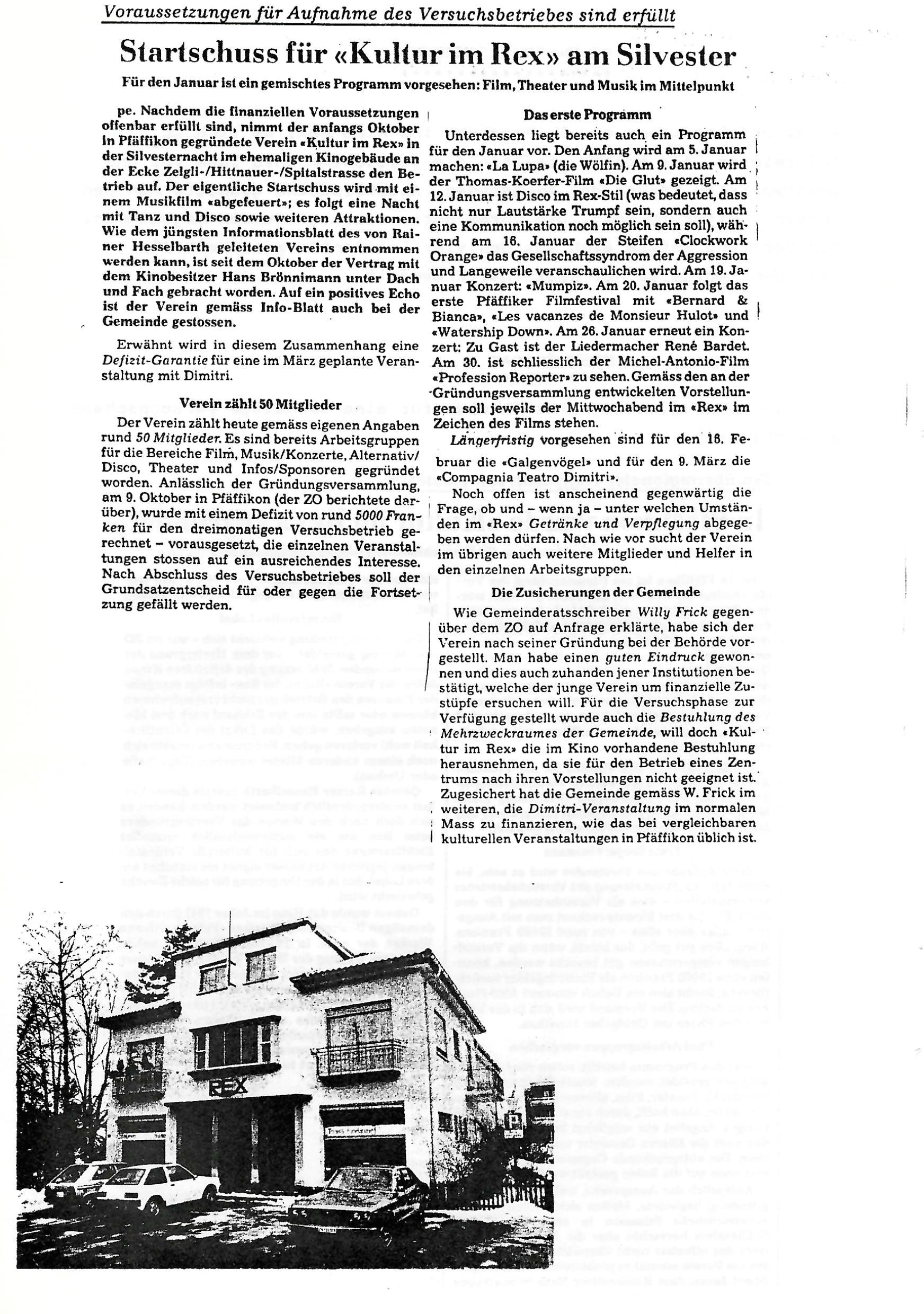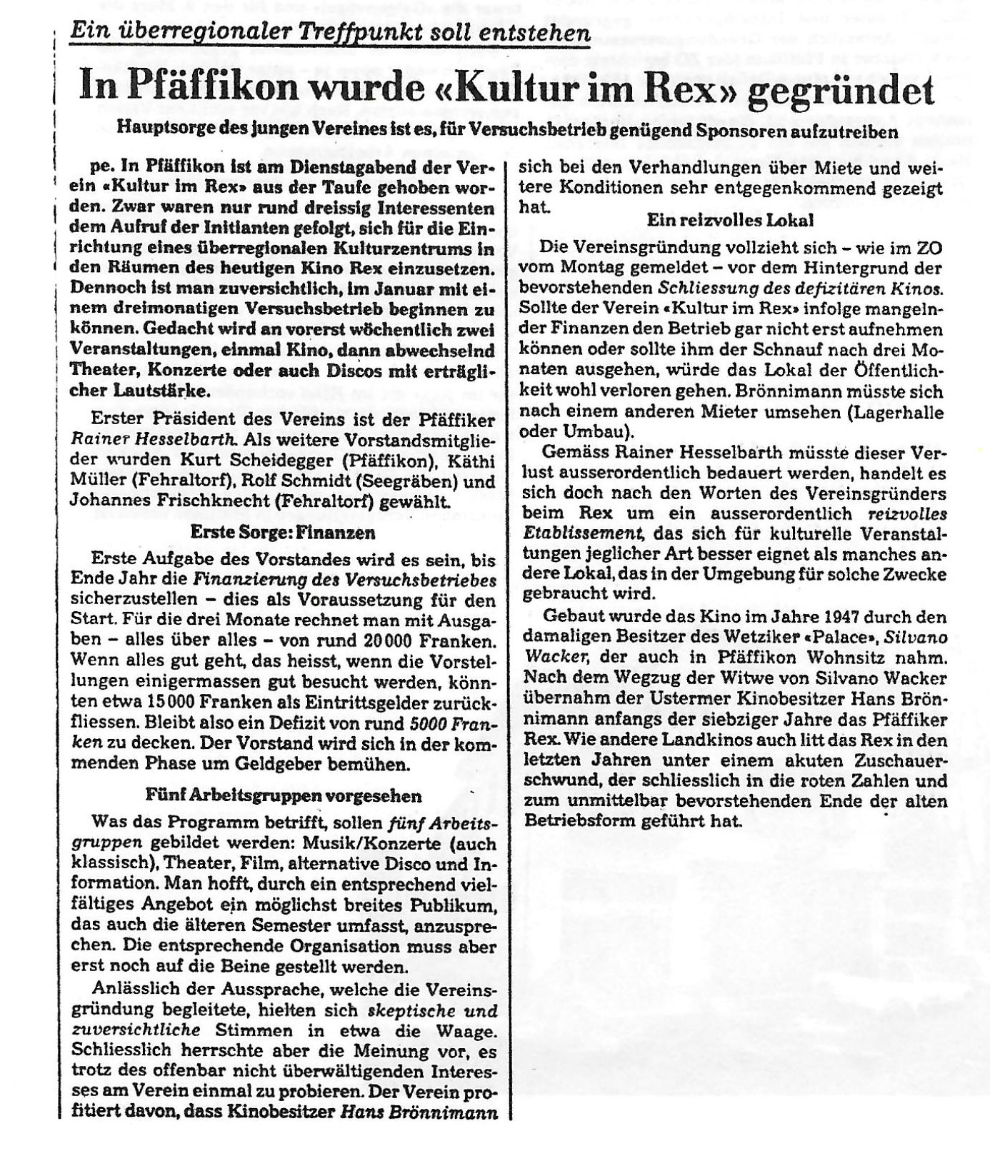 1984 wurde der Verein Kultur im Rex durch Rainer Hesselbarth gegründet. Der Verein stellte ein vielfältiges Kulturprogramm auf die Bühne mit Kinofilmen, Theater, Konzerten, Kindertheater, Literaturabende, Vorträge, Discos, Projekttage etc. Erste Veranstaltung: Silvester 1984/1985. Der Verein betrieb bis 2015 ein Kulturzentrum an der Spitalstrasse 1 und zog danach ins Chesselhuus.